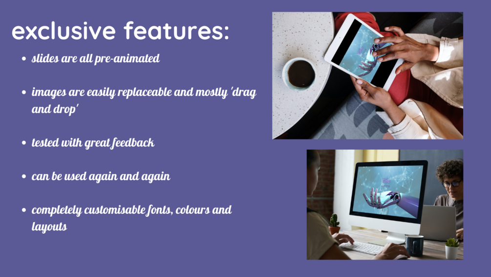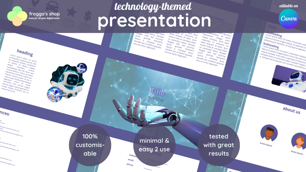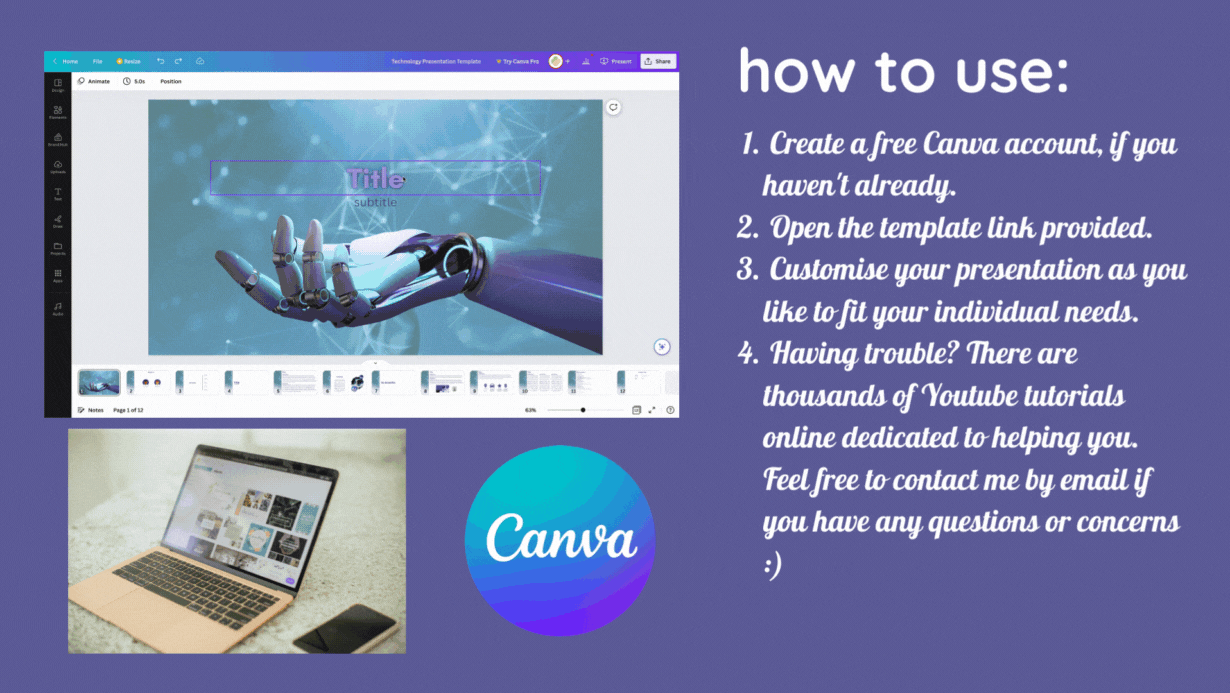 You'll get access to a 100% customisable Canva template perfect for your work, school, college, business and personal needs, fit with 11 pre-animated multipurpose slides that can be edited, duplicated, etc. to create the perfect presentation.